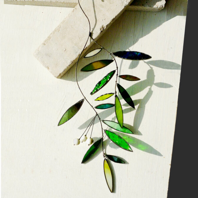 グリーン系のガラスとホワイトのアクリル玉を使った、アンティーク風の観葉植物です。