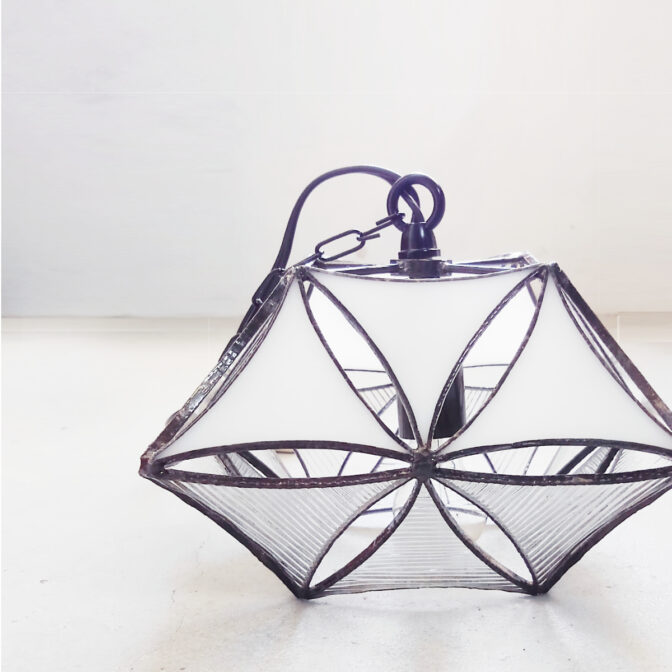 三角のガラスを、組み合わせたデザインのステンドグラスランプです。