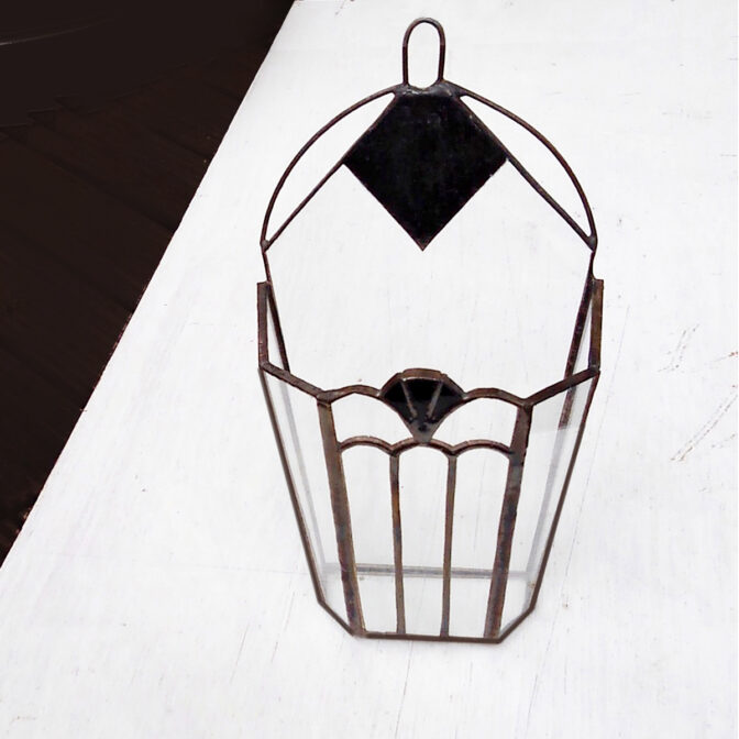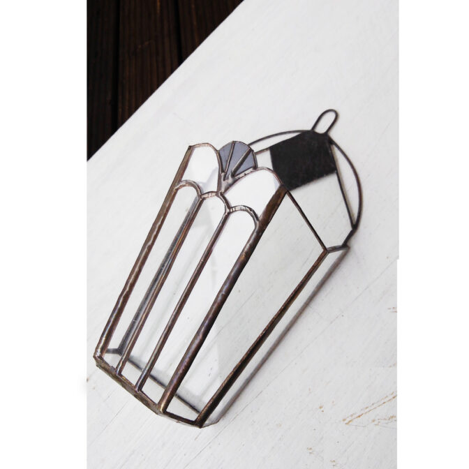 クリアガラスと銅シートにハンダ着色したもので制作しました壁掛け小物入れです。